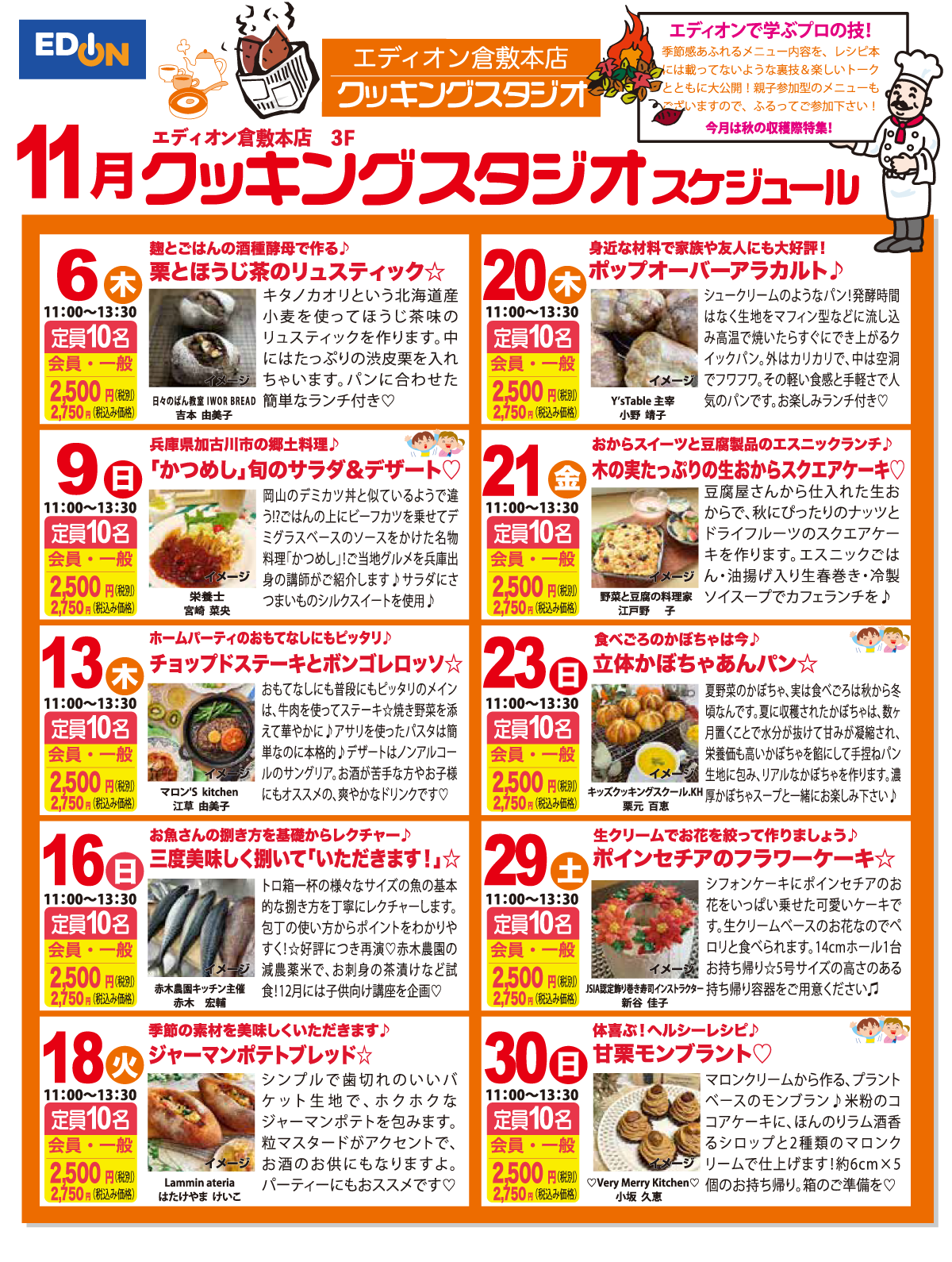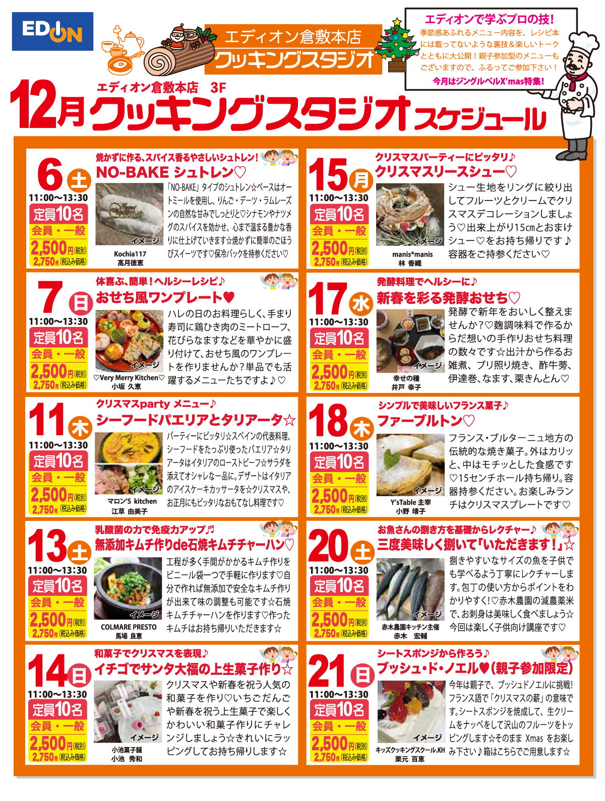 エディオン倉敷本店クッキングスタジオでは、季節感溢れるメニュー内容を、レシピ本には載っていないような裏技&楽しいトークとともに大公開!親子参加型のメニューもございますので、ふるってご参加ください。
